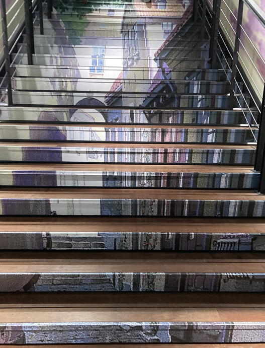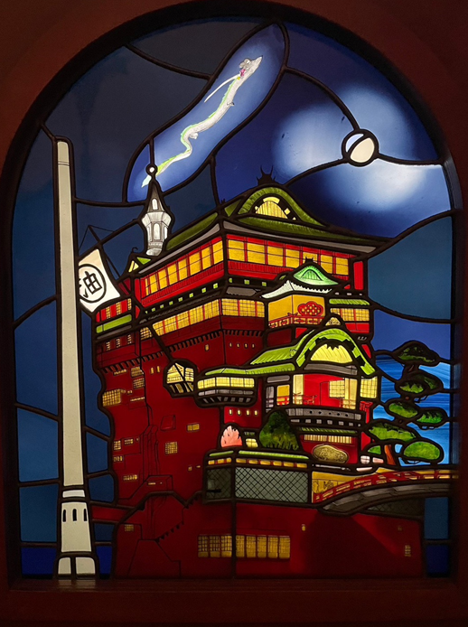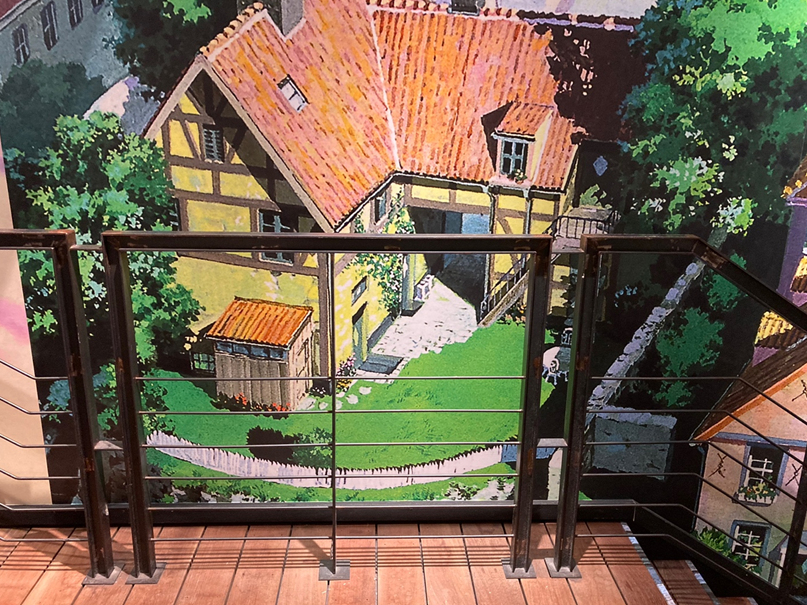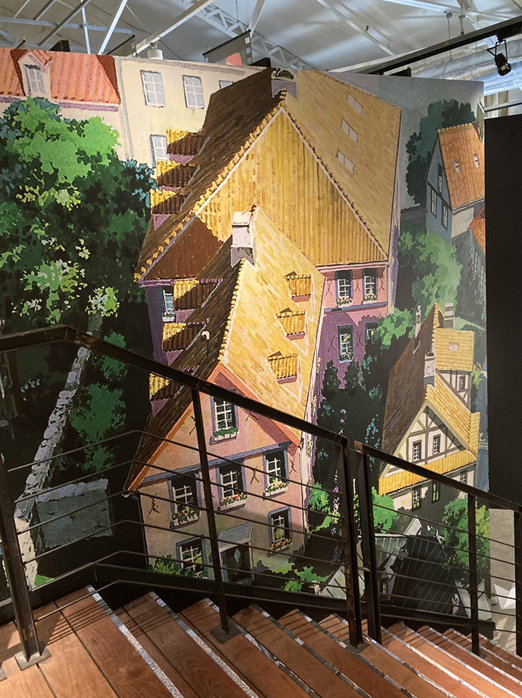 방영일지까지 관람하면 이제 2층 사진 스폿 입구가 나옵니다. 계단도 상당히 이쁘게 꾸며놨더라고요. 배경지를 보아하니 하울의 움직이는 성의 시내 안에 있는 집인가요?