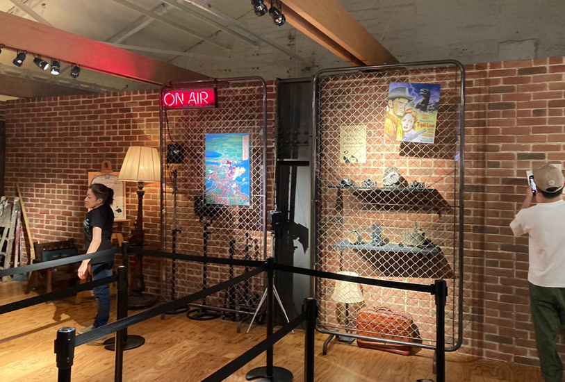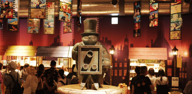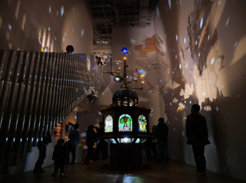 각종 영화의 OST 노래가 흘러나오면서 가운데이 있는 장치가 빙글빙글 돕니다. 그러면서 캐릭터가 새겨진 유리에 빛을 비추어 벽면에서 움직이는 효과를 주는데요. 영화 속 장면들을 환등으로 OST와 영사로 표현했다는 것이 역시 기대했던 것 이상으로 재미있었습니다. 마치 영화의 세계관을 소리와 영사로부터 체감할 수 있었다고 할까요?
