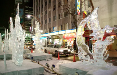 삿포로의 최대 번화가인 스스키노에 개최하면서 번화가의 장점인 대량의 건물 라이트가 얼음 조형에 네온사인 빛을 더해