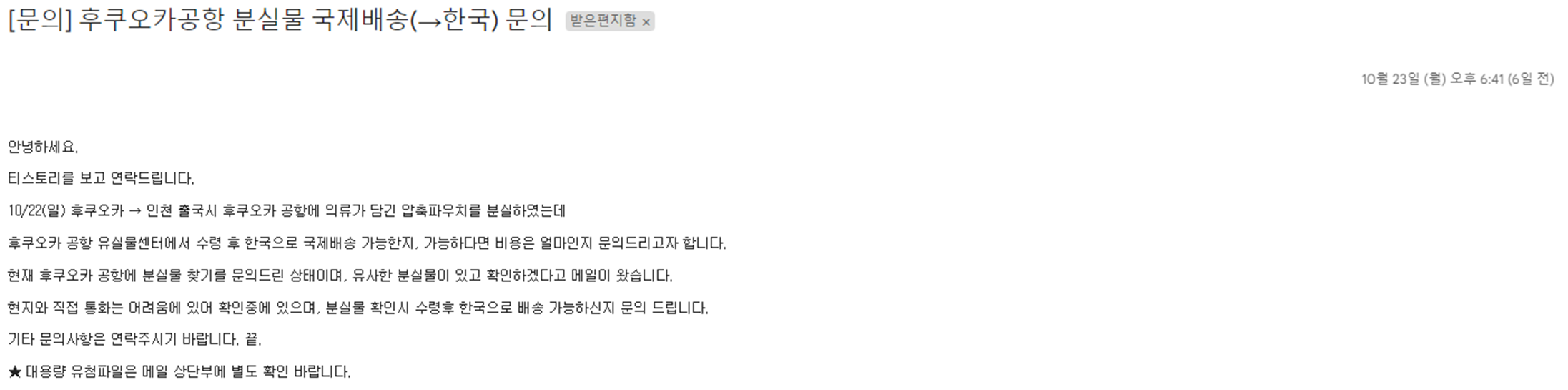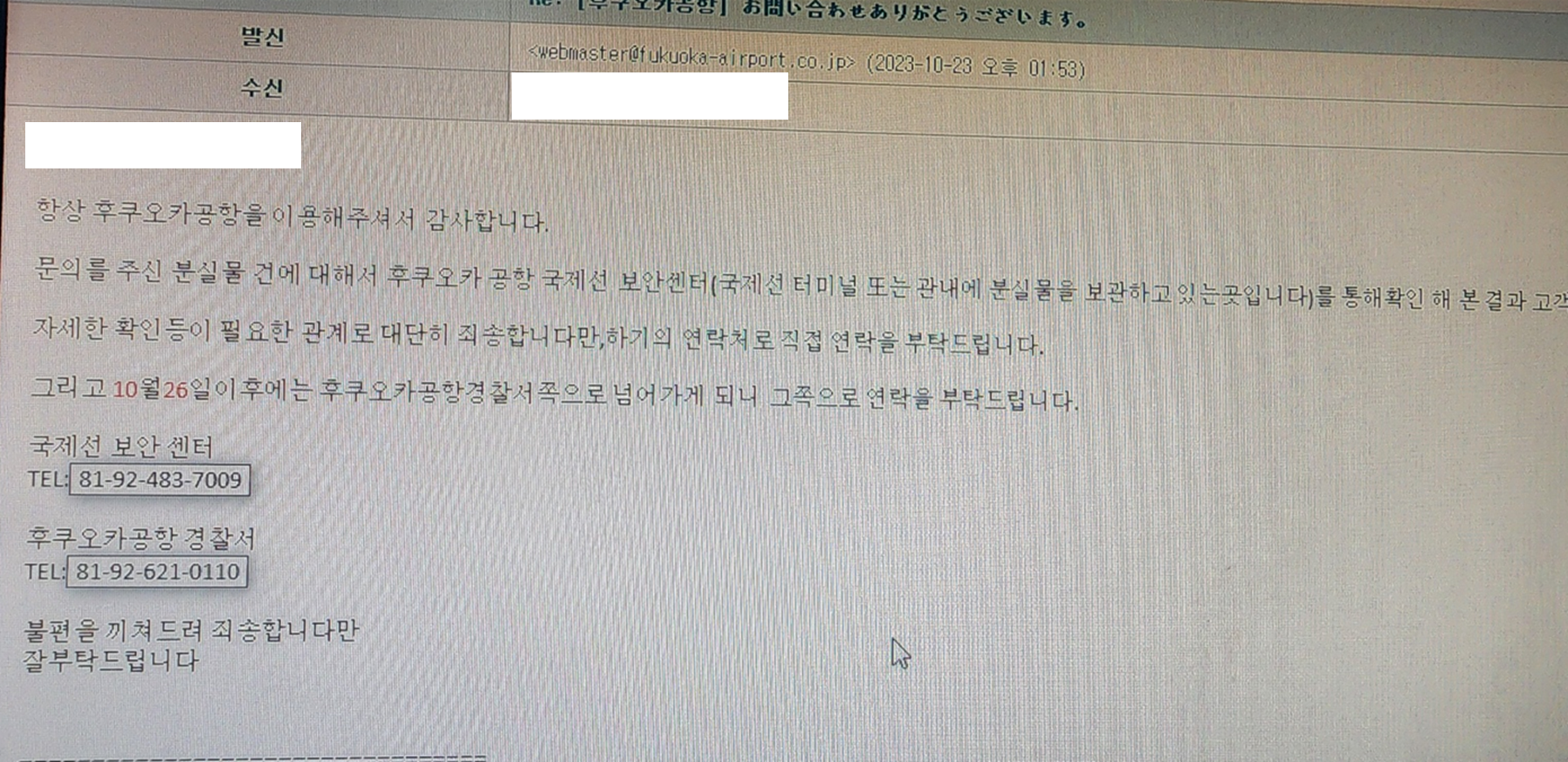 의뢰하신 분께서 먼저 후쿠오카 공항에 분실물 문의 메일을 넣으셨다고 했습니다.