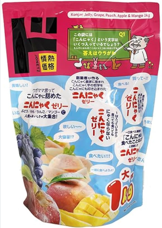 내용량은 1kg로, 1봉지당 약 62개의 곤약 젤리가 들어 있기 때문에 가족이나 친구들과의 나눠 먹는것은 물론 곤약 특성상 칼로리가 없어 밤에 배고플 때 건강을 생각한 야식에도 제격입니다.