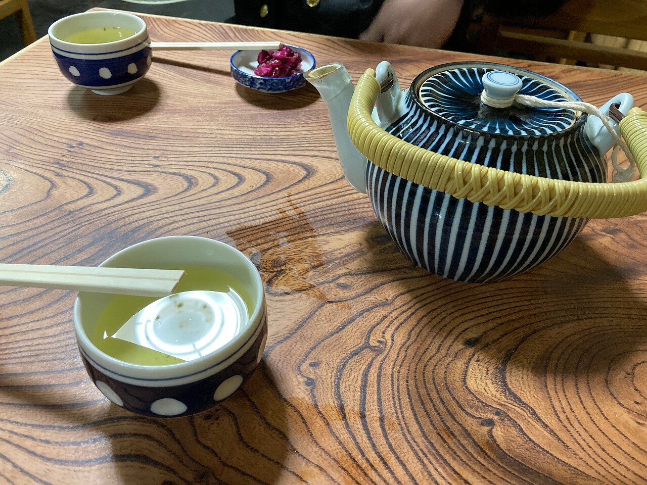 따뜻한 현미차와 츠케모노(절임) 으로 세팅해주는데