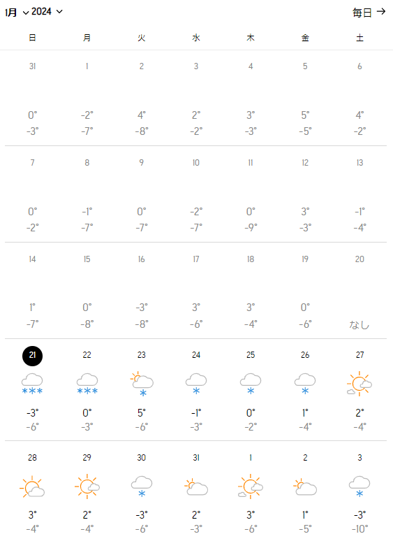 삿포로 1월 전체 날씨를 확인해 보겠습니다.