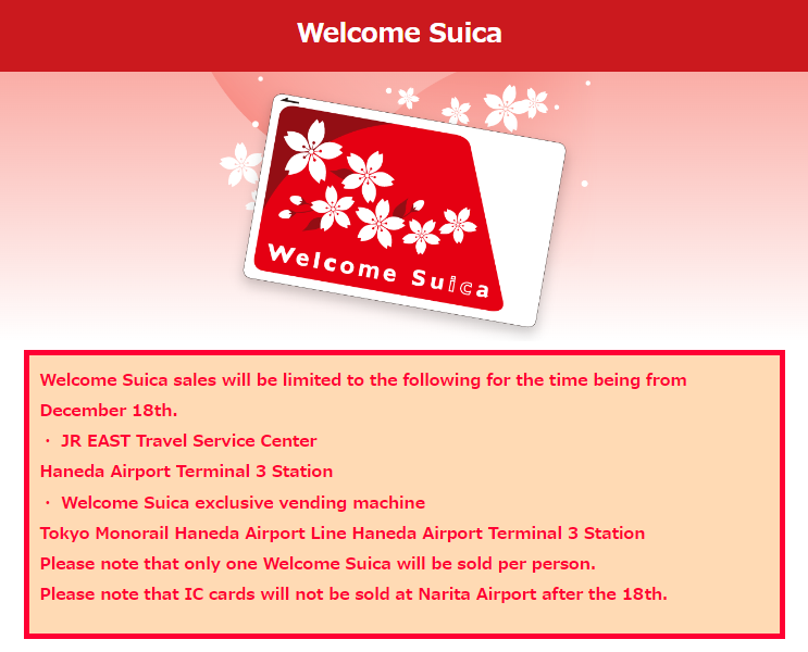 나리타 국제공항, 도쿄역 등 여러 지하철역에서 판매하던 웰컴스이카가 12월 18일 부로 판매를 중지합니다.