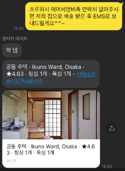 주소를 건네고 마지막으로 에어비앤비 담당자분께서 숙박자에게 최종 체크를 하고 바로 보내주셨습니다!