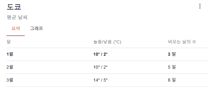또한 "구글"에서 "2월 도쿄 날씨"라고 검색하면 1월 평균 최고온도와 최저온도, 강수 일자를 파악하실 수 있습니다.