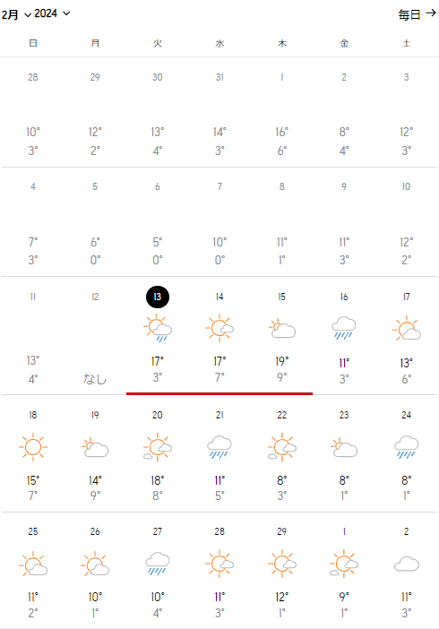 도쿄 2월 전체 날씨를 확인해 보겠습니다.