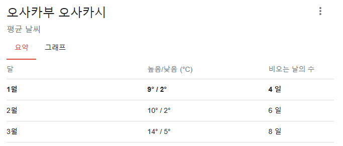 또한 "구글"에서 "2월 오사카 날씨"라고 검색하면 1월 평균 최고온도와 최저온도, 강수 일자를 파악하실 수 있습니다.