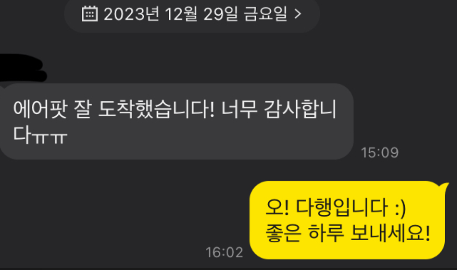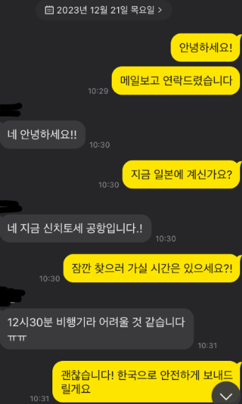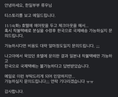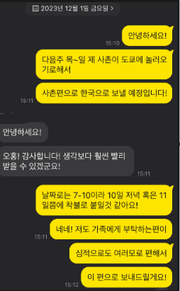 다행히도 12월 1일에 갑자기 가족이 일본 여행을 온다는 소식을 접한 후, 사람 손에 태워 보내기로 했습니다. 11월 21일에 의뢰를 받고 10일이 지나고 나서야 의뢰자분께 다시 연락을 드렸습니다.