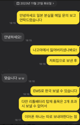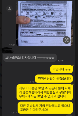위의 카톡내용에서 봐도 알 수 있듯이, 한국으로 몇 건이나 분실물을 배송해 드렸다는 자부심이 있어서 그랬나... 단순히 리튬배터리는 2개까지 국제배송이 가능하니,