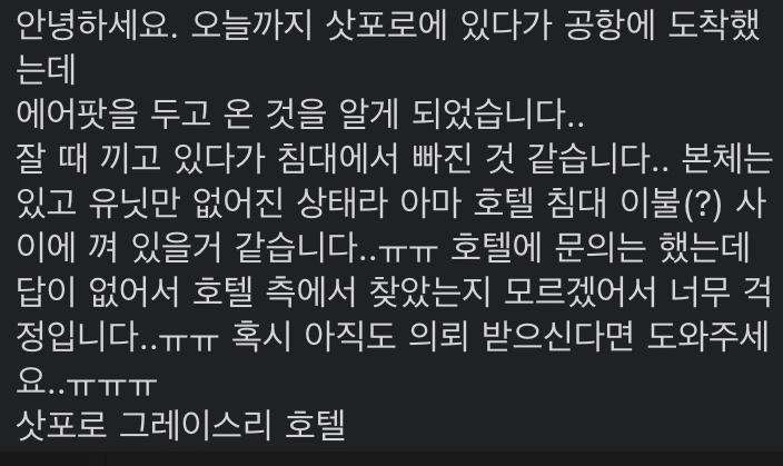 첫 번째 에어팟 의뢰자 분의 케이스는 에어팟을 나고야에 어느 호텔에 두고 한국으로 복귀해 버린 경우인데요. 호텔 측에서도 에어팟을 한국으로 보내줄 수 없다는 답변을 받고 저에게 의뢰를 주셨습니다.