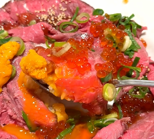 이게 바로 연어알과 성게알을 올린 로스트비프 덮밥입니다!
