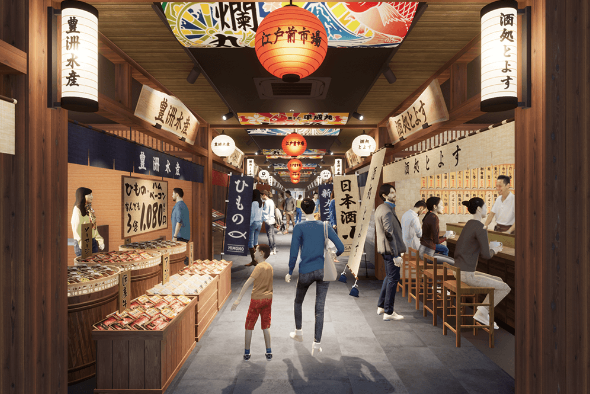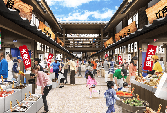 천객만래(센캬쿠반라이)는 도요스 시장에 인접한 곳에 오픈합니다. 24시간 운영되는 온천 빌딩 「도쿄 도요스 만요 클럽」과 에도의 거리 풍경을 재현한 음식 엔터테인먼트 빌딩 「도요스 바가이 에도마에 시장」의 2개 시설로 구성된 새로운 관광 스폿입니다.