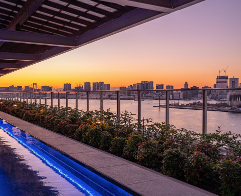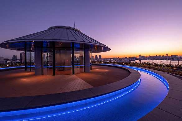 온천 건물에는 도쿄만(오다이바, 미나토구 바다)을 바라볼 수 있는 노천탕과 해안가를 360도 파노라마로 바라볼 수 있는 옥상 족탕 정원이 있습니다. 도요스 만요클럽 온천의 장점이라고 한다면 "온천수"가 특별하다는 점이죠. 미나토구 바다 근처에서 무슨 온천수?라고 하실 수 있겠지만 도요스 만요클럽에서는 매일 하코네와 유가와라 원천에서 온천수를 끌어오기 때문에 이런 특별한 온천수 안에서 오다이바 야경을 바라보며 온천을 즐길 수 있습니다.