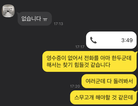 전부 다 걸어봤지만 부재중 또는 그런 물건은 접수되어 있지 않습니다. 라고 답변이 오더라고요. 주말은 역시 찾기가 힘듦...