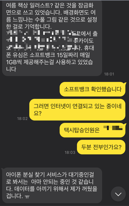 현금으로 결제하고 내린 택시라 영수증도 없고 택시의 정보가 "0"인 상황에 어떻게 해결할지 몰라 문의를 주셨더라고요. 잃어버린 물품은 어떻게 해서든 결국에는 찾아드리지만 저는 개인적으로 이런 의뢰를 좋아하지 않습니다.