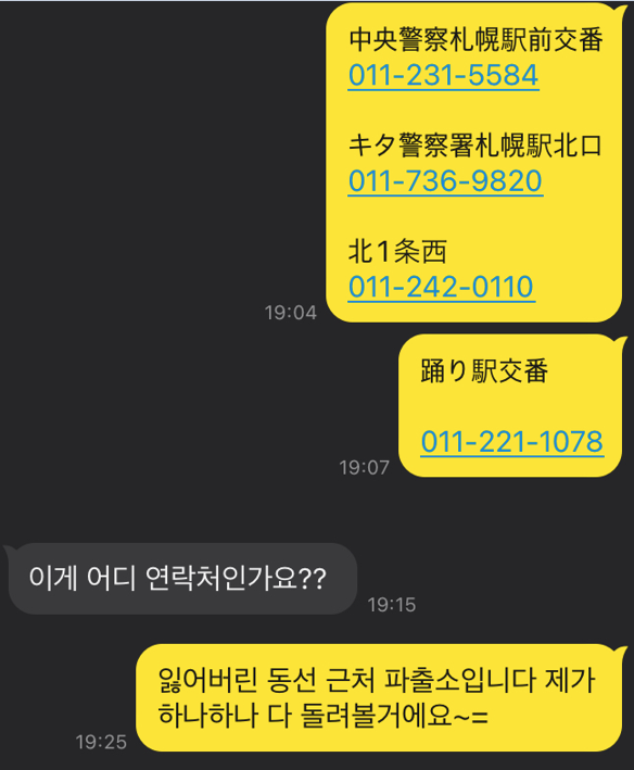 다행히도 하차한 곳 근처에 파출소(交番코반)가 있어서 제 정보와 함께 분실물 신청을 완료하시고 분실번호를 받았다고 연락을 주셨습니다. 저는 신청한 파출소 이외에 주변 파출소의 전화번호를 전부 조사한 후 우선 파출소에 전화를 걸었습니다.