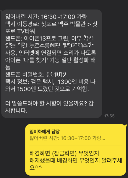 애매한 시간이라는 말은, 경찰서 혹은 택시회사에서 분실물 문의가 가능한 시간은 평일 09:00~17:00 이기 때문이죠. 직접적인 문의는 안된다고 판단하여 우선 의뢰자분께 "경찰서 or 파출소에 신고"하라고 전달했습니다. 또한 제 정보를 알려드려 분실물이 확인될 경우 바로 연락을 받을 수 있도록 조치를 취했습니다.