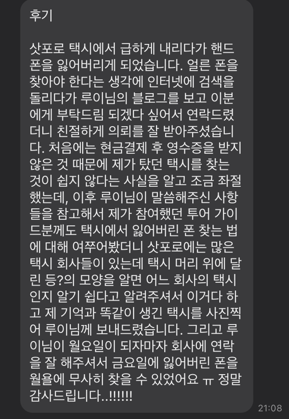 오늘은 "일본 택시에서 분실한 휴대폰"을 찾아드린 후기와 꿀팁을 알려드리려고 합니다.