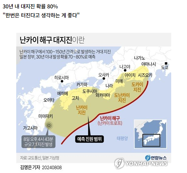 2024년 8월 8일 오후 8시경, 미야자키현에서 진도 7.1 지진이 발생한지 하루만에 도쿄 인근 가나가와현에서 진도 5 지진이 연이어 발생했습니다. 이번 지진이 특히 이슈가 되고 일본 전역에서 비상이 일어나는 이유는 "난카이 대지진"에 대한 우려때문인데요.