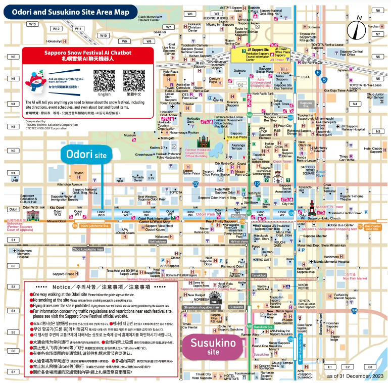 2025년 삿포로 눈축제는 난보쿠선 오도리역에 하차하는 방법이 가장 가깝고 삿포로역 혹은 스스키노역에서 도보로도 이동가능합니다. 구글맵스 어플에서 "오도리공원", "츠도무 행사장", "스스키노 행사장"이라고 검색하거나 아래 지도에서 참고해 보실 수 있습니다.