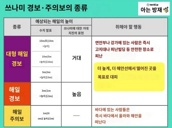 예를 들어 35m의 쓰나미가 예상될 경우 "대쓰나미 경보"가 발표되며, "예상되는 쓰나미의 높이는 5m"라고 발표됩니다. 지진의 규모(매그니튜드)가 8을 초과하는 거대 지진이 발생할 경우 최대 쓰나미 예상 등을 바탕으로 쓰나미 경보 및 주의보가 발표됩니다. 이 경우 처음 발표되는 대쓰나미 경보나 쓰나미 경보에서는 예상되는 쓰나미의 높이가 "거대"나 "높다"는 표현을 사용하여 비상사태임을 전합니다. 쓰나미의 높이를 "거대"라는 말로 대쓰나미 경보가 발표된 경우, 동일본대지진과 같은 거대한 쓰나미가 덮칠 우려가 있으므로 즉시 가능한 한 높은 곳으로 대피하세요.