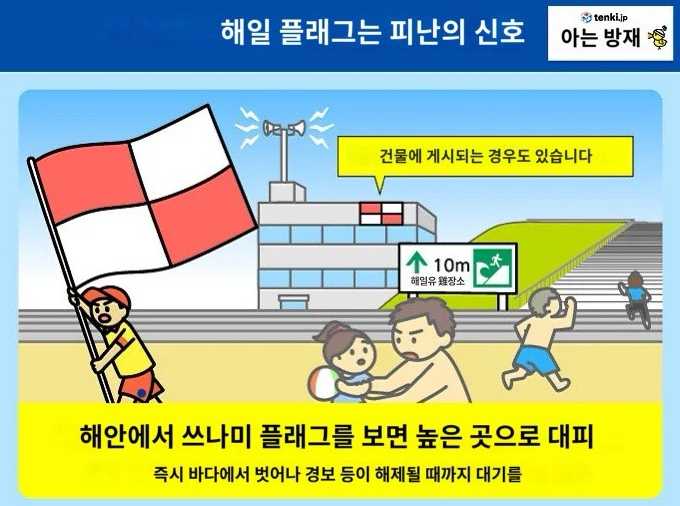 "쓰나미 깃발"는 대쓰나미 경보, 쓰나미 경보, 쓰나미 주의보가 발표되었을 때 해수욕장 등에서 사용됩니다. 해변이나 해상에서는 사이렌이나 스피커 등의 소리가 파도 소리나 바람 소리에 묻혀 들리지 않을 수 있기 때문에, 시각적으로 알 수 있도록 빨간색과 흰색 체크무늬의 플래그(깃발)를 사용하여 위험을 알립니다. 해수욕장이나 해변에서 "쓰나미 깃발"을 보게 되면 즉시 바다에서 멀어져 높은 지대나 쓰나미 대피 빌딩(타워)으로 대피를 시작하세요.