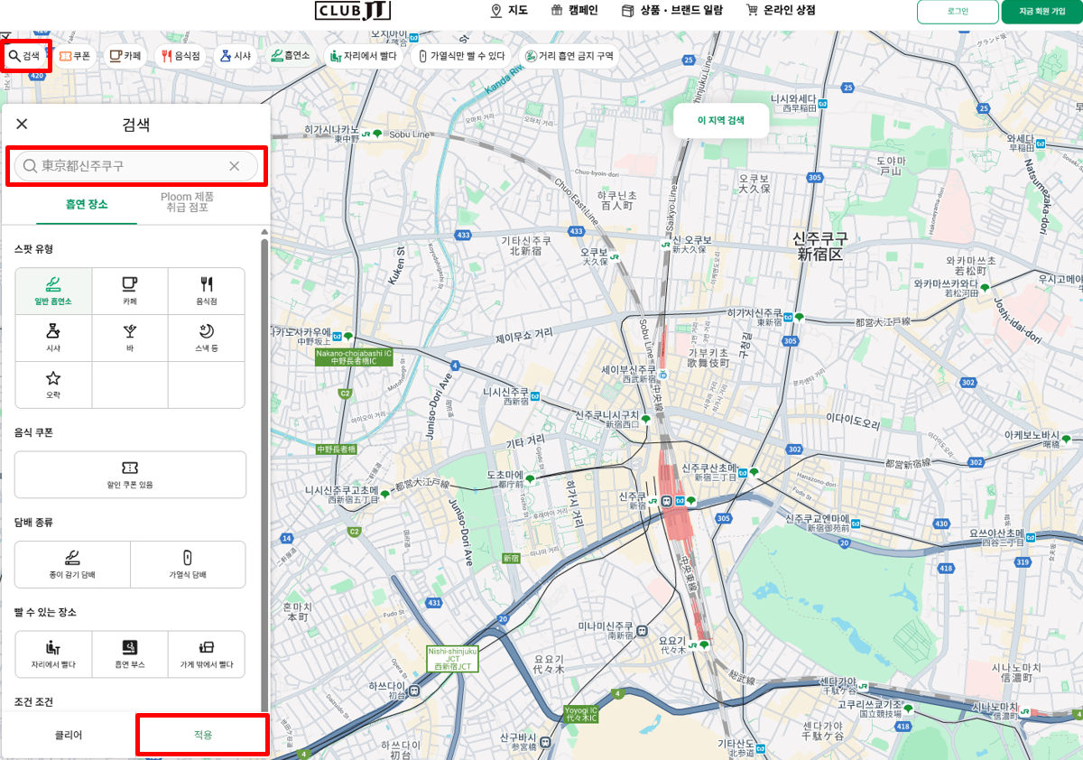 좌측상단에 "검색"을 클릭하신 후 여행할 지역을 검색합니다. 한글로 기입하셔도 괜찮습니다. 마지막으로 적용을 누르시면 흡연구역이 Map에 표시됩니다.