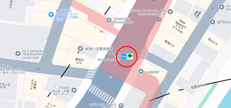 원형 테두리 마크는 같지만 회사 시그니처 표시가 다릅니다. 이 마크 또한 구글맵스에서 쉽게 확인 할 수 있어요. 아사쿠사역 같은 경우 도쿄 메트로의 긴자선 "G" 선과 아사쿠사 "A" 선이 둘 다 정차하기 때문에 구글맵스에 두 회사의 시그니처 마크가 표시되있는것을 확인 할 수 있어요.