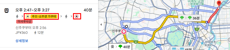 이번 예시는 신주쿠역에서 아사쿠사역으로 가는 이동 방법인데요.