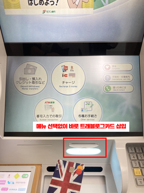 ① 카드 삽입: 처음 세븐일레븐 ATM 앞으로 가서 인출기 화면을 보면 다양한 메뉴가 있는데 뭐가 뭔지 모를 수 있어요. 이럴 때는 메뉴를 누르지 말고 먼저 트래블로그 체크카드를 삽입해 주세요.