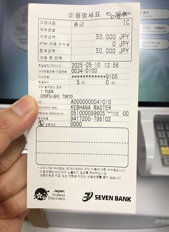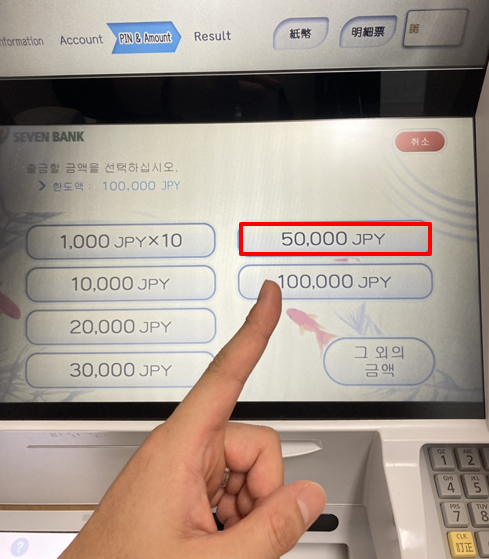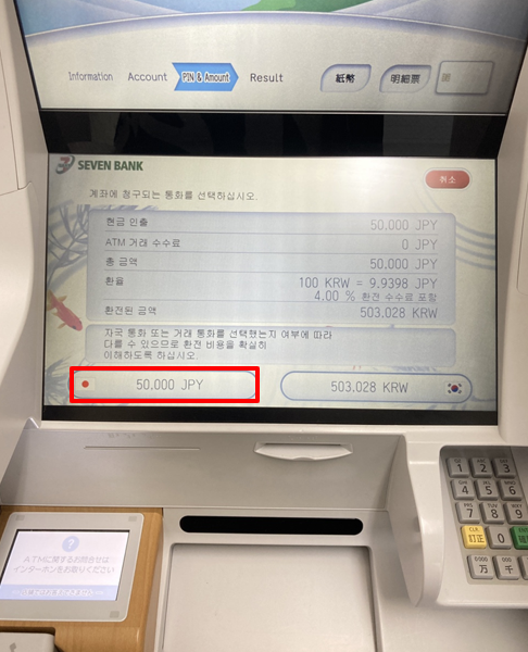 ⑦ 인출 완료: 50,000 JPY를 클릭한 후 현금 수령 및 영수증 출력