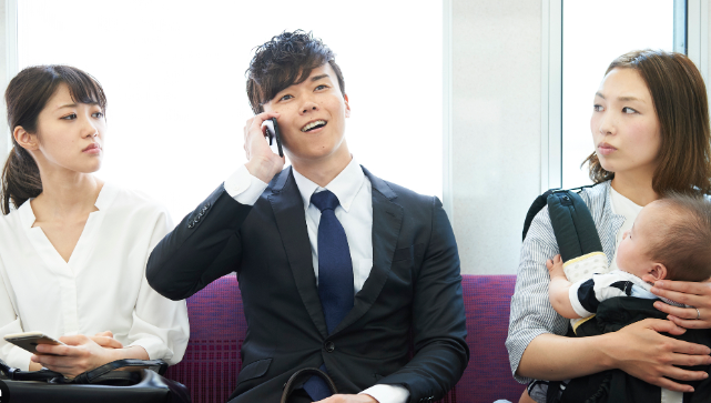 버스와 지하철 같은 공공장소에서 전화를 하지 않는 것이 매너입니다.