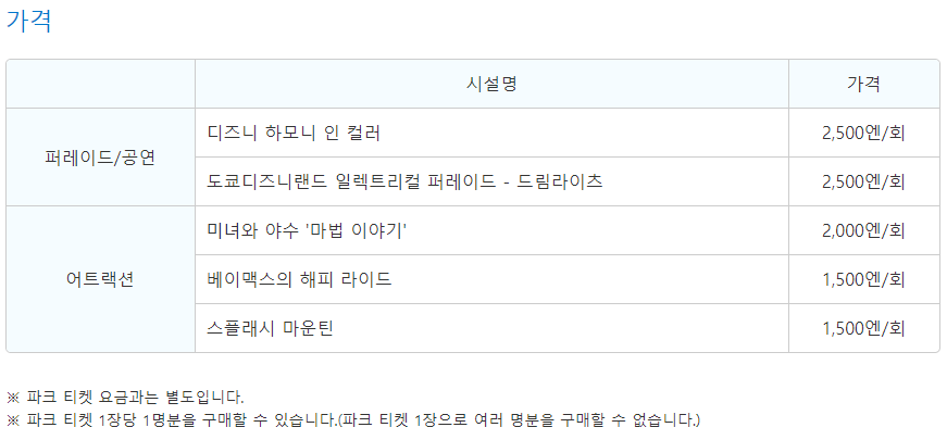 어트랙션이 아닌 퍼레이드까지 "추가로" 구매 가능합니다.