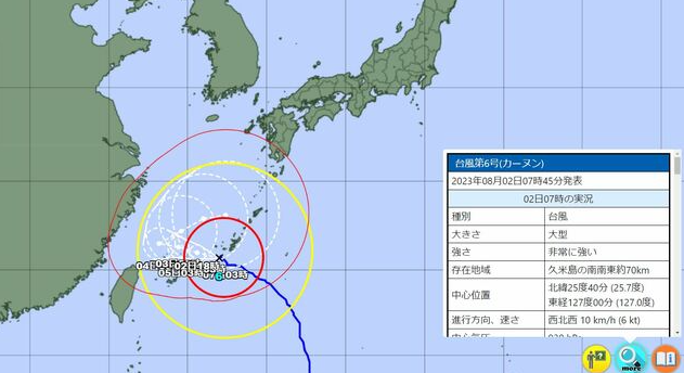 | 일본날씨정보 :: 8월 6일 태풍 6호 카눈 오키나와 재진입 & 예상 진로 (31) | 2023.08.06 |