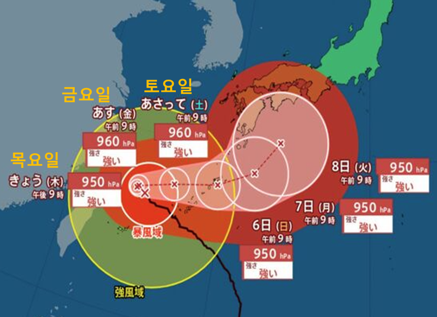 8월 7일 규슈, 시코쿠를 지나 8일에는 츄고쿠와 킨키로 이동할 것으로 예상된다고 합니다.