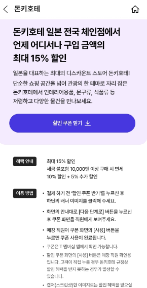일본 쇼핑하면 역시 돈키호테가 빠질 수 없는데요. 무려 15%나 할인을 적용할 수 있다고 합니다! 15%나 할인해준다고 하니 저도 멤버십 혜택 받아 쇼핑하고 싶네요...