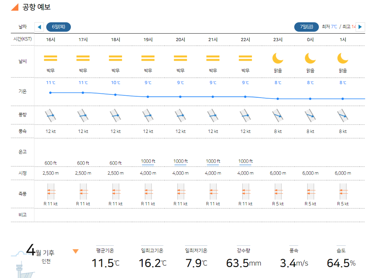 그리고 공항의 날씨 / 기온 / 풍향 / 풍속의 정보도