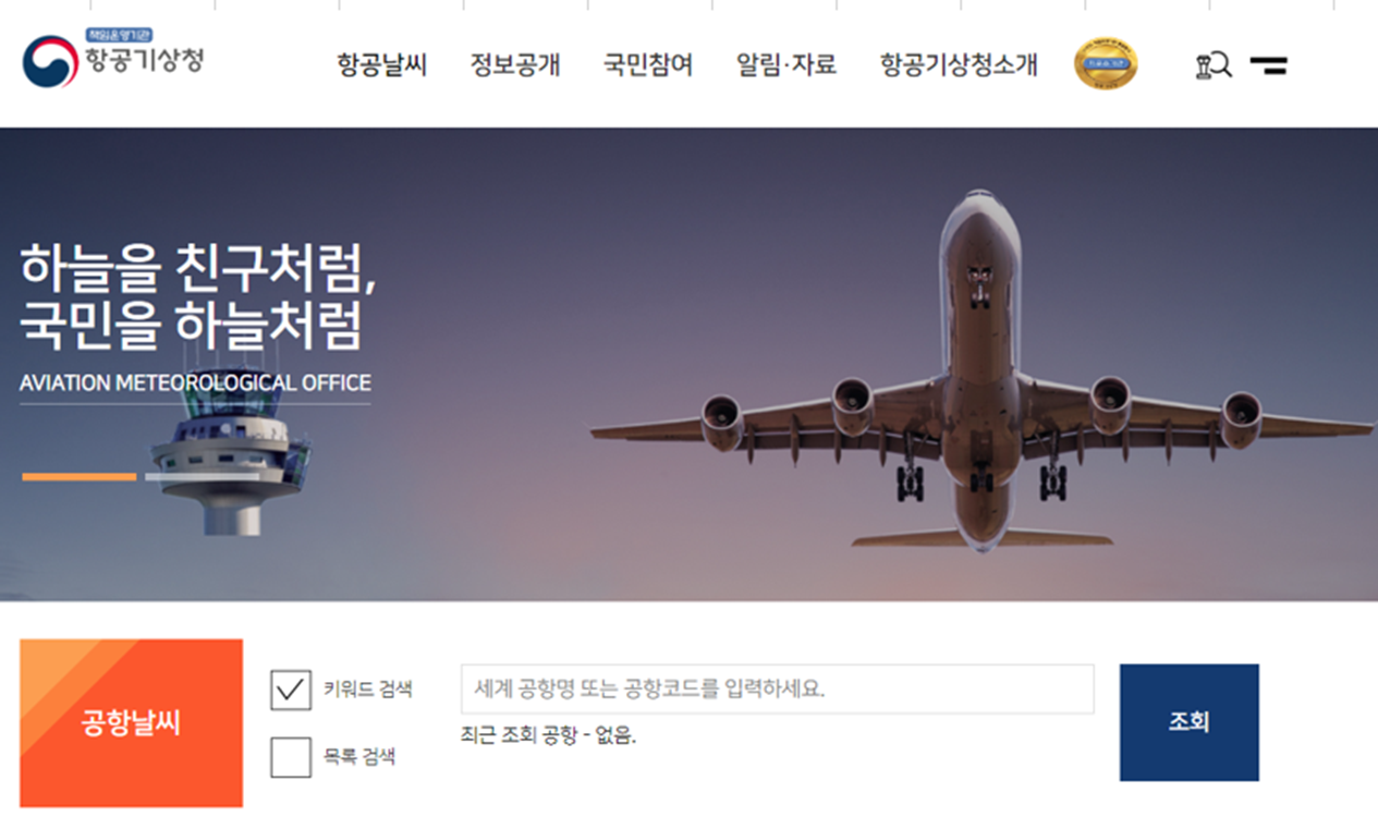 항공기상청 사이트에 접속하시면 메인 홈페이지가 나올 거예요.