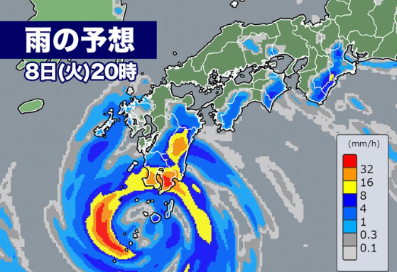 8월 8일 (화) 7시 가고시마 현 아마미시에서 동쪽으로 약 6km 떨어진 곳에 태풍 카눈이 위치하고 있습니다. 태풍은 9일 (수)를 중심으로 규슈 서쪽에서 천천히 북쪽으로 이동하면서 폭풍 지역을 동반하면서 세력을 강화할 전망입니다.
