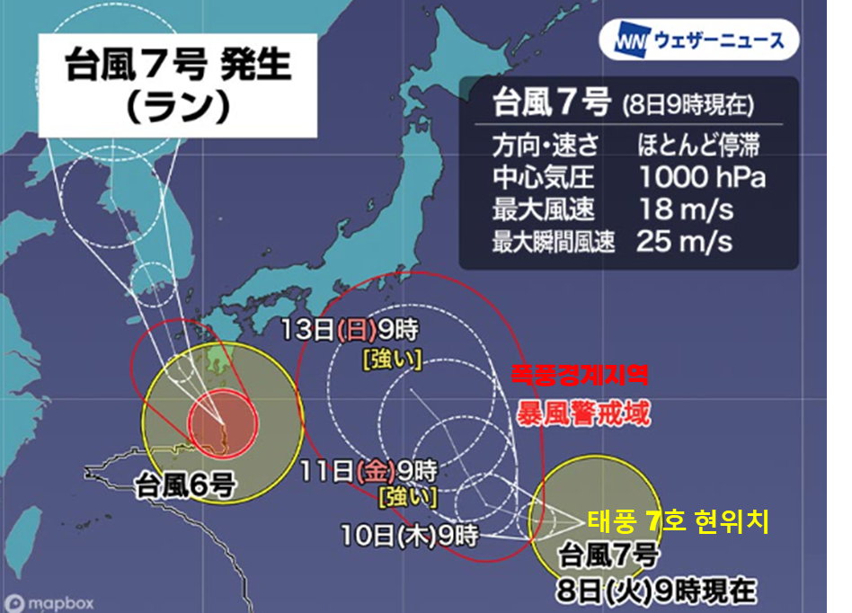 태풍 6호 카눈도 오늘 저녁부터 규슈방면에서 강한 폭풍과 폭우가 내릴것으로 예상되는데 태풍 7호 소식이 연이어 발표되어 걱정입니다. 더군다나 태풍 7호는 혼슈( 도쿄, 오사카 포함 )로 이동할 가능성이 높아보입니다.