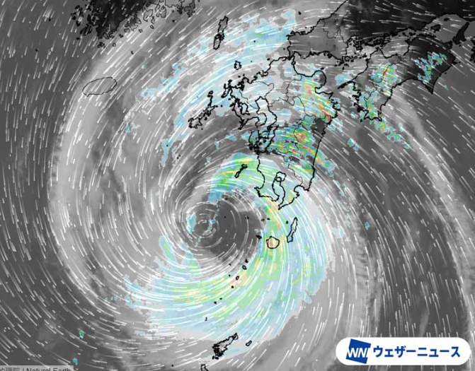 발달한 구름의 띠는 가고시마현 부근에 걸려 있고, 향후는 태풍의 진행 방향과 비구름의 띠의 흘러 들어가는 방향이 일치하는 가고시마현내를 중심으로 격렬한 비가 계속되기 쉬운 전망입니다. 총우량이 상당히 많아질 우려가 있기 때문에, 토사 재해나 하천의 증수 등에 경계가 필요합니다. 바람도 매우 강하고, 가고시마현 쿠라사키시에서는 최대 순간 풍속 41.8m/s를 관측하고 있습니다.